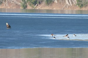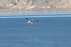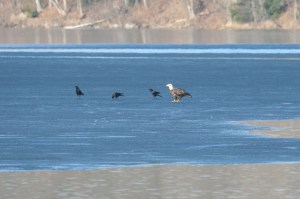 Have I told you that our farm is located on beautiful Fairfield Pond? It is truly a slice of paradise pie. This year, ice out was on March 21, 2012, the earliest date since 2004, the year I began recording. During that warm weather I was taking a nature break, enjoying the ducks, geese and mink. How often do you gaze up to the sky? Out here, particularly in spring and late fall, it’s good practice to do so every 20-30 minutes. And what to my wondering eyes did appear, an eagle in all its glory. My first thought was WOW as it flew right over my head, my second thought was LUNCH! The “ladies” were out and it began circling. Fortunately I made my presence clear and it flew away. The next day I spotted it out on the ice about 300 feet from the house. It happily hung out there for an hour with the ducks and crows then decided to take up roost in a large tree along our driveway. Nature is amazing on Fairfield Pond! Happy Spring!