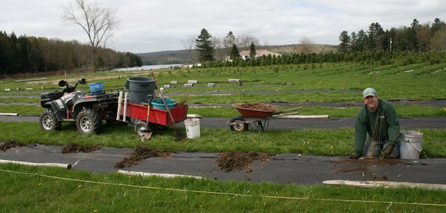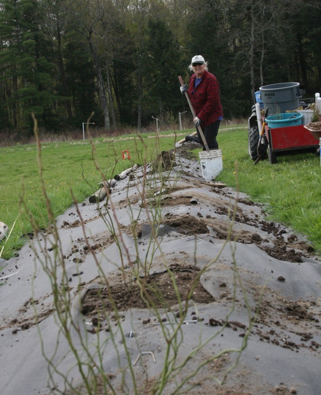 One week after planting Christmas trees our 145 blueberry plants arrived. We had prepped the raised beds last fall and wanted to give the soil at least six months to slowly lower the ph. The plants are thriving under just the right amounts of sun and rain. We’ve been picking off this year’s flowers (and bugs) so all energy goes into the plant the first year in their new home. If all goes according to plan, we’ll have blueberries available next year! Look for recipes, best freezing methods and more, on future posts.